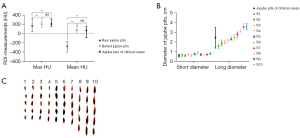 Ten kinds of dried jujube fruits were collected and numbered as S1–S10 (Table S3). Each type contained five dried jujube fruits. All jujube pits (n=50) were fixed on a plastic plate and performed with CT scans in air, first in raw state, followed by boiled. The CT scanning parameters were the same as those used in our clinical abdominal imaging protocol. Axial slices of 1.25-mm thickness were acquired. Size and radiodensity were measured by the two radiologists (QW and YS) using the same methods (mentioned in Quantitative CT image analysis, Figure S1). The measurement differences between the raw and boiled jujube pits were compared.