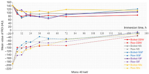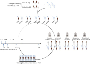 After analyzing the initial data (Figure S2 and Table S3), only jujube pits longer than 2.5 cm were chosen for further mimic phantom study, including 20 raw and 20 boiled jujube pits together. They were then equally divided into five groups and soaked in five different solutions: double distilled water, saline, commercially available simulated gastric fluid, commercially available simulated intestinal fluid, and mixed solution (30). Double distilled water was used as a control, while the other four solutions simulated the liquid conditions of the gastrointestinal tract and extracellular fluid. A mixed solution mimicking the human biological processes during food digestion was also used, in a way that jujube pits were soaked in simulated gastric fluid for the first 4 h followed by immersion in simulated intestinal fluid. CT scans (Revolution CT, GE healthcare, Milwaukee, WI, USA.) were performed on all the samples before and after immersion at 6 h, 12 h, 18 h, 1 d, 1.5 d, 2 d, 3 d, and 7 d, including conventional helical series at 120 kVp and dual-energy CT series (gemstone spectral imaging CT scan) (Figure 1), and 0.625-mm-thick contiguous slices were acquired from both series and stored as DICOM images for further processing. For the dual-energy CT series, monochromatic 40 keV images, water (-hydroxyapatite) images, and water (-iodine) images were reconstructed on the gemstone spectral imaging viewer. The images were evaluated by the two radiologists (QW and YS), including measurements of density and water content as well as visual assessments of density and water content (Figure S1). Mean-HU changing trends of JPs in monochromatic 40 keV images over immersion time were analyzed.