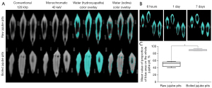 In the quantitative analysis of density and water content, the changing trends of mean-HU between the raw and boiled jujube pits were different. The change in the values of CT attenuation of the raw jujube pits over immersion time showed an upward trend, while the mean-HU of boiled jujube pits decreased slightly and then slightly increased (Figure 7). There was no statistical difference between the measurements of water content corresponding to the water-iodine and water-hydroxyapatite basis pairs. As for the structure of the jujube pits, water content ranged from high to low: high-density area of shell, slightly lower density area interior, and low-density hollow area. The percentage of blue area on water (-hydroxyapatite) images was statistically significant between raw and boiled jujube pits (50.16%±1.83% vs. 89.78%±0.67%, P<0.05) (Figure 8).