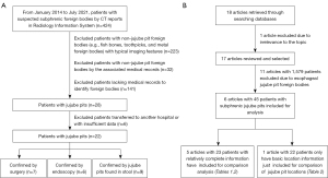 The study was conducted in accordance with the Declaration of Helsinki (as revised in 2013). Institutional ethics board of Tongji Hospital approved this retrospective cross-sectional study (No. TJ-IRB20211142), and informed consent was waived because of the retrospective nature of the study. Patients who visited Tongji hospital, between January 2014 and July 2021 with CT reports suggesting a subphrenic foreign body were retrospectively reviewed. Inclusion criteria were patients with subphrenic jujube pits confirmed by surgery, endoscopy, or jujube pits found in stool during clinical follow-up. Exclusion criteria were patients with non-jujube pit foreign bodies by typical imaging features (e.g., fish bone, toothpick and metal foreign body) on CT images (25-28) or identified by medical records, insufficient data, and those transferred to another hospital.
