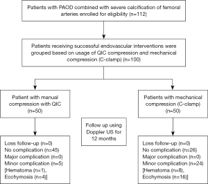 The study is a prospective nonrandomized observational study. From February 2014 to September 2018, 100 subjects with chronic PAOD combined with severe calcification of the femoral arteries, as confirmed via the ankle-brachial index (ABI), Doppler ultrasonography, and computerized tomography angiography (CTA), were enrolled in this study. The 100 participants underwent successful endovascular interventions with the use of various sheaths, ranging from 6 to 8 F. Because QIC is a self-pay medical material in Taiwan, the patients were informed and decided to use QIC or not for compression the puncture site. In this study, 50 participants decided MC with QIC, and the other 50 participants selected mechanical compression with C-clamp. Besides, we followed up all of the participants during hospitalization, and also arranged a return visit in outpatient department (OPD) and closely telephone contact. Therefore, there was no loss to follow-up of the participants during the investigation.