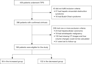 Volume measurement by computed tomography (CT) is increasingly becoming widely used in clinical studies, with high accuracy (14,15). Although imaging-based liver volume assessments are increasingly being conducted before hepatectomy or transplantation, studies of how the liver volume changes after TIPS are not sufficient. One study noted that there was no difference in liver volume before and after TIPS insertion (16). However, another study found that pre-TIPS liver volume affects post-TIPS liver volume changes (17). To address this lack of a unified conclusion, the purpose of the present study was to investigate the variation regularity of liver volume after TIPS and the related factors. We present the following article in accordance with the STROBE reporting checklist (available at https://qims.amegroups.com/article/view/10.21037/qims-22-482/rc).