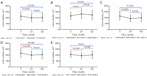 A total of 168 patients were included in the study; among them, 49 patients had pre-TIPS, 2±1 months post-TIPS, and 9±3 months post-TIPS follow-up CT scans. As shown by the line chart in Figure 2A, the mean liver volume at 2±1 months post TIPS was decreased by 12.9% compared to the baseline liver volume (992.8±322.6 vs. 1,140.1±326.6 cm3, P<0.001). The mean liver volume at 9±3 months post TIPS was 1,018.6±345.1 cm3, which was not significantly different from that at 2±1 months post TIPS (P=0.27). At 9±3 months post TIPS, the liver volume had still not returned to its pre-TIPS level. The overall liver volume change at 9±3 months post TIPS was still lower than that before TIPS insertion.