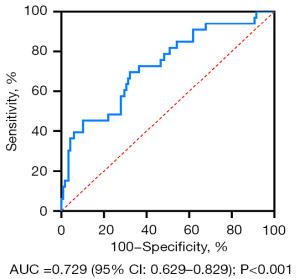 Each patient was given a Logit(P) risk score for predicting increased liver volume based on grade 3 ascites, ALB, and pre-TIPS L3-SFA, which was shown as Logit(P)=1.683-0.078 (ALB) -0.01 (pre-TIPS L3-SFA) +0.996 (grade 3 ascites =1; non-grade 3 ascites =0). A ROC curve analysis was performed (Figure 3), which produced an AUC of 0.729 and a Youden index of 0.375.