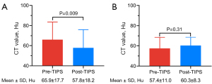 In the increased liver volume group, the average CT value before TIPS insertion was higher than that after TIPS insertion (65.9±17.7 vs. 57.8±18.2, P=0.009) (Figure 4A). In the decreased liver volume group, the average CT value before TIPS insertion was not significantly different from that after TIPS insertion (57.4±11.0 vs. 60.3±8.3, P=0.31) (Figure 4B).
