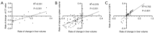 We next analyzed the correlation between the change rate of liver volume and the change rate of CT value at 3 months after TIPS insertion in the increased liver volume group (Figure 5A). The results showed that there was a strong correlation between the change rates (R2=0.551, P<0.001). Correlation analysis further showed that the change rate of liver volume at 2±1 months post TIPS was significantly correlated with that of spleen volume (Figure 5B), R2=0.378, P<0.001. Also, at 9±3 months post TIPS, the change rate of liver volume was significantly correlated with the change rate of the L3-SFA (Figure 5C), R2=0.782, P<0.001.