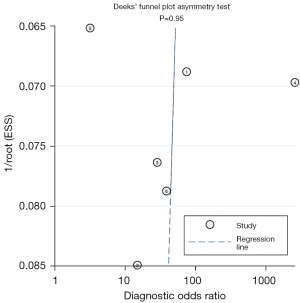 The Deeks test with Stata software was used to examine publication bias; P>0.05 indicated that there was no substantial publication bias in the included papers. Figure 6 shows the publication bias test for NIC in the arterial phase combined with the slope in the arterial phase. The publication bias tests for the remaining parameters are shown in https://cdn.amegroups.cn/static/public/qims-22-527-3.pdf.