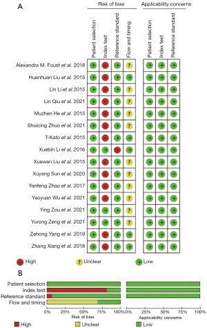 We used the QUADAS-2 tool to evaluate the quality of primary diagnostic accuracy studies, and Figure 2 summarizes the overall risk of bias and applicability concerns for this research.