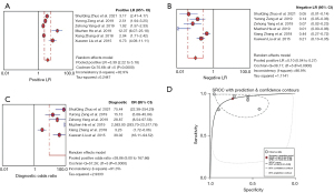 Due to the small amount of studies on some parameters, the diagnostic performance of only 15 indicators was analyzed. The data on the TPs, FPs, TNs, FNs, sensitivities, and specificities of each parameter, as well as main characteristics, are shown in Appendix 3. Each parameter included in the analysis had varying degrees of heterogeneity (available online: https://cdn.amegroups.cn/static/public/qims-22-527-1.pdf). The effect sizes of the diagnostic sensitivity, specificity, positive likelihood ratio, NLR, diagnostic ratio, and area under the SROC curve (AUC) are summarized for each parameter of DECT in Table 3.