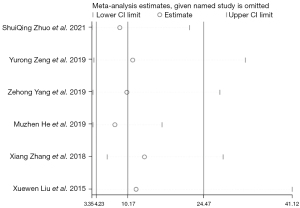 The above effect size synthesis and data analysis found that the NIC in the arterial phase combined with slope in the arterial phase had the highest AUC. We focused on the sensitivity analysis of this combination. As shown in Figure 5, regardless of which study was excluded, the final combined result was not significantly affected, indicating that each study had little influence on the general results. As such, the results of this study were stable. We also examined sensitivity analysis results for other parameter combinations, which are shown in https://cdn.amegroups.cn/static/public/qims-22-527-2.pdf, and these results were all stable.