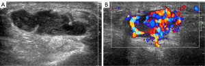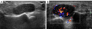 MRI of the left foot showed a volar nodule of the first metatarsophalangeal joint, demonstrating an intermediate T1 signal with T2 hyperintensity (Figure 3). Ultrasound examination showed a heterogeneous hypoechoic oval mass 27 mm ×16 mm ×13 mm in size between the first and second metatarsophalangeal joints of the palm of the left foot with a clear boundary and a regular shape (Figure 4A). The mass was adjacent to the first and second metatarsal bones and the flexor digitorum tendon. A rich blood flow signal was detected in the mass (Figure 4B). These results, in combination with the patient’s clinical history and blood biochemistry, suggested the presence of PMT.