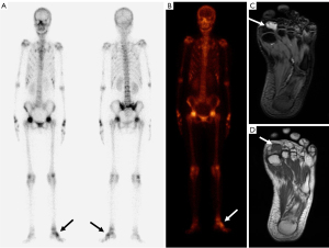 A 55-year-old female presented with progressive bone and muscle pain in her chest wall and lower limbs concomitant with a mass in her right plantar pedis over the past 3 years. Three years ago, the patient accidentally found a soft tissue mass 1 cm × 3 cm in size in the right plantar pedis. The mass did not protrude from the skin surface and had no obvious tenderness or pain. Meanwhile, she had no symptoms, so the patient did not pay much attention to the mass. Two months after the discovery of the mass, the patient started to experience pain in many parts of the body. One year ago, due to the progressive aggravation of pain, the patient went to the local hospital and was diagnosed with osteoporosis according to CT. She was given supportive treatment, such as calcium supplements, but she felt there was no obvious improvement after treatment.