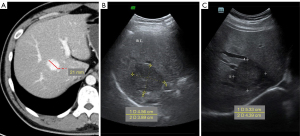 A hepatic nodule was incidentally detected in a 29-year-old man during an ultrasound examination while checking the condition of a hypoechoic lesion 3 years ago. The instant CT examination revealed a low-density nodule with a length of about 21 mm (Figure 1A). After 29 months of ultrasound follow-up, the length of the lesion increased to 46 mm (Figure 1B). The ultrasound and MRI with the contrast agent of gadobenate dimeglumine after 36 months showed a mass about 53 mm in length (Figure 1C). The patient had no medical history of chronic liver disease or cancer. The patient’s laboratory test results, including routine blood tests, blood biochemical examinations, and liver function tests, were normal.