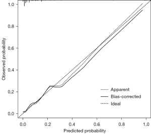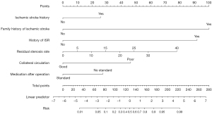 To determine the independent predictors for ISR, according to the results of univariate analysis, the statistically significant factors (P<0.05) in the univariate analysis were subsequently entered into the multivariate logistic regression model. The preoperative stenosis rate, residual stenosis rate, diabetes mellitus history, ischemic stroke history, family history of ischemic stroke, history of ISR, collateral circulation, and medication after operation were further entered into the binary logistic regression analysis. Statistical significance was defined as a P value <0.05, and the strength of influence was estimated according to odds ratios (OR). The optimal residual stenosis rate was calculated according to the receiver operating characteristic (ROC) curve, and the sensitivity, specificity, and Youden index were calculated. According to the Kaplan-Meier curve, we analyzed the cumulative risk of ISR during follow-up in the ISR group using the log-rank test. The clinical prediction model for ISR after CAS was constructed with RStudio (Boston, MA, USA). A nomogram was constructed based on a binary logistic regression model, and the concordance index (C-index) and calibration curves were used to assess the discrimination and calibration of the nomogram.