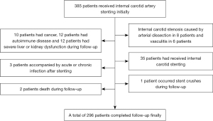 This retrospective case-control study recruited 296 patients who were treated in the second hospital of Hebei Medical University from June 2015 to December 2018. These patients satisfied the following inclusion criteria: (I) severe stenosis of the internal carotid artery (ICA) atherosclerosis (C1 segment ≥70%) with stent therapy; (II) willingness to be followed up, including undergoing a carotid Doppler ultrasound; (III) a modified Rankin scale (mRS) ≤2 before stenting; and (IV) not in the acute phase of ischemic stroke (more than 2 weeks after onset). The exclusion criteria were as follows: (I) ICA stenosis caused by nonatherosclerotic factors, such as cardioembolic stroke, arterial dissection, vasculitis, fibromuscular dystrophy, or moyamoya disease; (II) carotid artery interventional treatment; (III) cancer, autoimmune disease, severe liver or kidney dysfunction, or other serious diseases; (IV) acute or chronic infection; and (V) death that occurred during follow-up. There were 89 patients excluded from the study: 14 patients had nonatherosclerotic stenosis; 35 patients had received carotid artery interventional treatment; 34 patients had cancer, autoimmune disease, severe liver or kidney dysfunction, or other serious diseases; 3 patients had an acute or chronic infection; 1 patient had stent crushes; and 2 patients died during the follow-up. The flow diagram of participant selection at each stage is shown in Figure 1. Simultaneously, we collected relevant clinical data, including age, sex, traditional vascular risk factors (including hypertension, diabetes mellitus, coronary artery disease, current smoking, current drinking, total cholesterol, triglyceride, low-density lipoprotein cholesterol), blood cell count, homocysteine, high-sensitivity C-reactive protein, uric acid, stenosis degree before stenting and residual stenosis rate, and drug therapy after stenting. This retrospective study was approved by the Institutional Ethics Committee of the Second Hospital of Hebei Medical University (No. 2020-R384), and all patients or their families signed an informed consent form. The study was conducted in accordance with the Declaration of Helsinki (as revised in 2013).