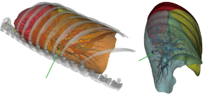 A 49-year-old Chinese man who had presented to The First Affiliated Hospital of Dalian Medical University 3 years prior with a pulmonary pure GGN on CT examination was admitted due to increased nodule density. Postadmission CT examination revealed an 8-mm mixed GGN in the right lower lung (Figure 1A). Due to high suspicion of early malignancy, it was decided that VATS right lower lung wedge resection would be performed. We used a mobile 3D C-arm system for preoperative pulmonary nodule localization because the GGN was located next to the spine and was difficult to reach and locate with the hands or surgical instruments during surgery (Figure 1B). Before implementation, we planned a localization path using the patient’s 3D-reconstructed lung images (Figure 2). The purpose of this was to reduce the time required to locate the pulmonary nodules using the mobile 3D C-arm system for the first time. Moreover, if localization had failed, we planned to perform right lower pulmonary lateral and posterior basal (S9+10) segmentectomy based on the 3D reconstruction of the lung.