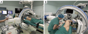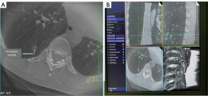 Cios Spin, a new generation of mobile 3D C-arm system, is currently primarily used in orthopedics for precise intraoperative guidance (5). It acquires 3D images in 3 projections (lateral, coronal, and sagittal) through complementary metal oxide semiconductor detectors. The high resolution of the 3D image allows the observation of very tiny anatomical structures around the target. The radiation dose for a single 3D scan can vary from 6 to 38 mGy (6). The mobile 3D C-arm system has a lower upfront cost and a smaller footprint than does the cone beam CT system (7), and can easily shuttle between operating rooms. In recent years, there have been a few research reports on using the mobile 3D C-arm system in the field of pulmonary nodule intervention. Both Avasarala et al. (8) and Sadoughi et al. (7) reported successful transbronchial biopsy of lung nodules using a mobile 3D C-arm system. Chen et al. (9) demonstrated the feasibility and clinical value of the mobile 3D C-arm system for assisting transbronchial biopsy and ablation of GGN lesions. Although Hsieh et al. (10) were the first to report clinical experience with the mobile 3D C-arm system for preoperative pulmonary nodule localization, our team improved the process by using a series of more optimized localization protocols.