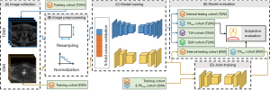 Before the model was trained, the axial images were resampled to a uniform pixel spacing, the median of the pixel spacing of the training cohort, to offset the bias caused by resolution inconsistency (T2WI images: 3.00×0.51×0.51; DWI images: 3.00×1.41×1.41). The input patch size of images was the average nonzero area of all images (T2WI images: 14×352×352; DWI images: 20×174×250). Then, the intensity of the images was normalized using z score normalization.