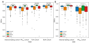 Figure 2 Boxplot of the distribution of DSCs. (A) The DSCs of the overall prostate gland, the apex, midgland, and base of the prostate in the internal testing cohort, the PXtest cohort, the TJH cohort, and the BJH cohort using T2WI. (B) The DSCs of the overall prostate gland, the apex, midgland, and base of the prostate in the internal testing cohort and the PXtest cohort using DWI. **, P<0.01; ***, P<0.001. DSC, Dice similarity coefficient; T2WI, T2-weighted images; DWI, diffusion-weighted images; PXtest cohort, testing group of the PROSTATEx Challenge dataset; TJH, Tongji Hospital; BJH, Beijing Hospital.