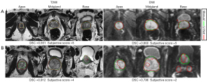 Figure 3 Examples of segmentation results. (A) In this case, the 3-dimensional U-Net model (red line) showed a good overlap with the manual segmentation (green line) in the apex, midgland, and base (from left to right) of the prostate on both T2WI and DWI, with an overall DSC of 0.931 for T2WI and 0.860 for DWI. The subjective scores for both T2WI and DWI segmentation results were 5. (B) In this case, the overall DSC was 0.912 on T2WI and 0.796 for DWI. The subjective score for T2WI was 4, which required minor modification in the apex and base of the prostate. As for DWI images, the model showed a poor overlap with the manual segmentation, with a subjective score of 2. T2WI, T2-weighted images; DWI, diffusion-weighted images; DSC, Dice similarity coefficient.