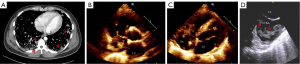 Three days prior to admission to our hospital, the patient developed a fever, and his temperature was 38.3–38.8 ℃. A review of the chest CT (September 17, 2019) showed diffuse multimorbidity in bilateral lungs, with rapidly progressing lesions, which were considered diffuse alveolar hemorrhage with vasculitis. Thrombosis in the right atrial was possible. In order to seek further diagnosis and treatment, he was transferred to the First Affiliated Hospital of Guangzhou Medical University (September 18, 2019). His vital signs at admission were as follows: temperature, 36.9 ℃; heart rate, 123 bpm; breath, 23 bpm; blood pressure, 114/60 mmHg; oxygen saturation (SPO2), 81%; and bilateral lower lung auscultation with crackles. The white blood cell (WBC) count was 10.5×109/L, the C-reactive protein (CRP) level was 2.14 mg/dL, and his hemoglobin (Hb) level was 50 g/L. The results of chest enhancement CT and 3-dimensional reconstruction (September 19, 2019) showed multiple polymorphic lesions in bilateral lungs, suggestive of vasculitic lesions or hematogenous lung infection may be possible, and alveolar hemorrhage in bilateral lungs (Figure 1A). The patient also had a right atrial filling defect (vegetation or thrombosis) and multiple slightly low-density nodules in the liver suggestive of hematogenous intrahepatic infection. Based on the results of relevant examinations, the possibility of a hematogenous disseminated lung abscess was considered. Vancomycin and meropenem were administered to counter the infection, and voriconazole was administered for antifungal treatment. The liver ultrasound and contrast ultrasonography (September 20, 2019) showed that intrahepatic lesions were benign (infectious lesions may be possible). The transthoracic echocardiography (TTE; September 19, 2019) review revealed an enlargement of vegetation on the tricuspid valve (Figure 1B) and a new neoplasm at the entrance to the inferior vena cava (Figure 1C). Transesophageal echocardiography (TEE; September 24, 2019) further found vegetation to the right auricle without adhesion to the tricuspid valve, with a size of 68 mm × 29 mm (Figure 1D). During hospitalization, multiple bacterial and fungal blood cultures were negative.