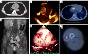 CT, computed tomography; CEUS, contrast-enhanced ultrasound; MRI, magnetic resonance imaging; TTE, transthoracic echocardiography; CE, contrast echocardiography; PET-CT, positron emission tomography-computed tomography; VIDE, vindesine, ifosfamide, doxorubicin, etoposide; RA, right atrium; VIT, vincristine, irinotecan, temozolomide.
