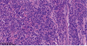 Subsequently, 18F-FDG and 68Ga-DOTATATE PET-CT scans were conducted to evaluate the presence of multifocal lesions or distant metastases. The whole-body maximum intensity projection (MIP) image revealed that the neck (Figure 2A,2B, short black arrow) and thoracic region (Figure 2A,2B, long black arrow) had a focal and increased FDG and DOTATATE uptake lesion, respectively. Axial CT of the neck showed a soft tissue lesion in the right upper neck region (Figure 2C,2D, short blue arrow) with moderate FDG accumulation [maximum standardized uptake value (SUVmax) of 3.92] and significantly intense DOTATATE accumulation (SUVmax of 51.0) on PET-CT fusion images (Figure 2E,2F, long blue arrow) and PET images (Figure 2G,2H, orange arrow), respectively. Interestingly, axial CT of the anterior mediastinum showed an irregular soft tissue mass close to the ascending aorta (Figure 2I,2J, short white arrow) with intense FDG uptake (SUVmax 7.56) and relatively intense DOTATATE uptake (SUVmax 20.79) on PET-CT fusion images (Figure 2K,2L, long white arrow) and PET images (Figure 2M,2N, red arrow), respectively. Based on the above findings, it was suggested that the right neck mass was a PGL and that the anterior mediastinal mass was possibly another primary tumor. Right carotid body aneurysm resection and autologous saphenous vein bypass of the right common carotid-ICA were performed on August 20, 2021. Postoperatively, the patient presented with a slight tongue deviation to the right and experienced hoarseness, choking, or coughing while drinking water. Considering the patient’s inability to tolerate joint cervical and thoracic surgery, subxiphoid video-assisted thoracic surgery thymectomy and anterior mediastinal mass resection were performed 4 months later on December 21, 2021. Serum and urine catecholamine metabolite levels were not rechecked postoperatively. No new complications occurred. Histopathologic examination of the neck and thoracic lesions confirmed the diagnosis of 2 primary synchronous PGLs (Figure 3; Figure 4), and immunohistochemical analysis of thoracic lesions showed that chromogranin A (CgA), S-100, and synaptophysin (Syn) were all positive (Figure 4). All procedures performed in this study were conducted in accordance with the ethical standards of the institutional and/or national research committee(s) and the Declaration of Helsinki (as revised in 2013). Written informed consent was provided by the patient to publish this case report and accompanying images. A copy of the written consent is available for review from the editorial office of this journal.