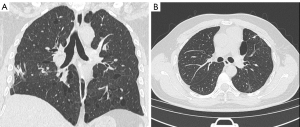 Case B was the 29-year-old son of case A. He first came to our hospital on May 19, 2014 with spontaneous pneumothorax, which he had had three times in total. The patient had no history of smoking or occupational dust exposure. Chest CT showed pulmonary cysts, which were mainly distributed in the lower lung and bilateral subpleural lungs (Figure 3A). This patient has a total of pulmonary cysts in both lungs. Pulmonary cysts in the lower lungs accounted for 52% (43/82) and subpleural accounted for 71% (58/82). The largest cyst, measuring 35 mm ×21 mm ×44 mm in diameter, was in the left upper lobe (Figure 3B). In the hand examination, the patient showed double finger deformities similar to those of his father. The patient underwent bullae resection, and pathological examination of the resected specimens confirmed lung bullae (Figure 4).
