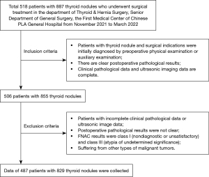 In all, 487 patients with 829 thyroid nodules who underwent surgery in the First Medical Center of the Chinese PLA General Hospital from November 2021 to March 2022 were attained to the study. Age, gender, size, and pathology concerning the thyroid nodules, as well as the results of dynamic AI, preoperative routine ultrasound, and FNAC diagnosis were reviewed retrospectively. To be eligible for inclusion in the study, patients had to meet the following criteria: (I) with thyroid nodules and surgical indications initially diagnosed by physical or auxiliary check-up before surgery, (II) clear postoperative pathological results available, and (III) the complete clinical pathological data and ultrasonic imaging data. Patients with incomplete clinical pathological or ultrasound image data, those with unclear postoperative pathological results, those with FNAC class I (unsatisfactory or nondiagnostic) or class III (atypia of uncertain significance) results, and those with other types of malignant tumors were excluded from the study. Figure 1 shows the flowchart of patient enrollment.