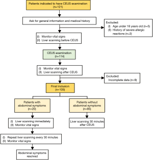 Before CEUS examination, all the patients underwent liver scanning under B-mode ultrasound with MI 1.1 to 1.3. At the end of CEUS, all the patients conducted liver examinations, which observed under B-mode and CEUS settings (MI 1.1 to 1.3). MI of 1.1 to 1.3 was defined as high MI under CEUS mode. During observation time, if the patient did not experience discomfort, we performed liver scans 30 minutes after the CEUS examination and recorded the images under B-mode and CEUS settings. If the patient appeared to have abdominal discomfort, we immediately performed the liver examination and recorded the images under B-mode and CEUS settings. We did the abdominal scanning every 30 minutes until the patient’s abdominal discomfort was relieved. The flow chart of the study design was illustrated in Figure 1.