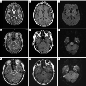 | 1 | Pons, bilateral caudate nucleus head, thalamus | The pons lesions were symmetrical with a butterfly shape, and the bilateral caudate nuclei and thalamus lesions showed a symmetrical strip shape | The pons signal was a symmetrical long T1/ long T2 signal | There was no significant change in the patient’s symptoms |