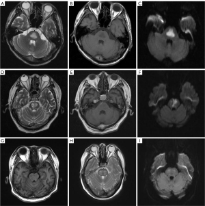 All patients underwent routine MRI scans of the brain with a Siemens 3.0T MRI scanner (Simenns Skyra 3.0T) and 16-channel head phased array coil and routine axial MRI scans of the brain. The parameters for T1-weighted imaging (T1WI) were a repetition time (TR) =1,300 ms, an echo time (TE) =8.6 ms, a field of view (FOV) =22 cm × 22 cm, a matrix =256×256, and a slice thickness of 6 mm; the parameters for T2-weighted imaging (T2WI) were a TR =4,000 ms, a TE= 90 ms, an FOV =22 cm × 22 cm, a matrix =256×256, and a slice thickness of 6 mm. The horizontal Axis T 2 liquid inhibition inversion recovery sequence parameters were as follows: a TR =6,000 ms, an inversion time =2,028 ms, a TE =90 ms, an FOV =22 cm × 22 cm, a matrix =256×256, and a slice thickness of 6 mm. The transverse diffusion-weighted imaging (DWI) parameters were as follows: a TR =6,400 ms, a TE =98 ms, an FOV =22 cm × 22 cm, a matrix =256×256, a slice thickness of 6 mm, and a b value of 0 and 1,000 s/mm2.