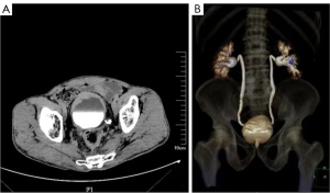 A comprehensive examination of the bladder was performed next. Computed tomography urography (CTU) demonstrated irregular thickening of the urinary bladder wall and protrusion inside the bladder lumen, particularly on the anterior wall of the bladder (Figure 2A,2B). Cystoscopy and biopsy findings revealed that the neoplastic cells were arranged in nests or single file, with inconspicuous mitotic figures and little atypia. Immunohistochemical staining showed the urothelial markers. The samples were positive for Ki67 (positive rate was 5%), P53 (focal positive), CK (AE1/AE3), GATA3, CK7, and p63. The features were comparable to those of UC; however, the Ki67 expression was found to be low.