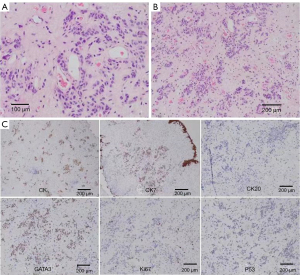 The bladder’s pathological findings were in agreement with those of invasive UC, as evidenced by the infiltration of NVUC into the vasculature, nerves, and adipose tissue surrounding the bladder. Infiltration of carcinoma tissue was observed in the muscle layer of the cut margin of the bilateral ureters. The tumor cells in the rectal wall displayed a nest-like distribution and heteromorphism. Metastasis of UC was observed in the rectal muscularis mucosae, submucosa, surrounding fatty tissue, and external anal sphincter. The mucosal layer of the rectum did not have infiltrations. Metastases were observed in the lymph node along the right external iliac artery (1/1) and perivesical lymph node (1/1). The pTNM stage was pT3b, N2, M1b. The immunohistochemical staining findings were as follows: Ki67 (8%), P53 (30%), CK (AE1/AE3), S100P, GATA3, CK7, and p63 were positive (Figure 5A-5C).