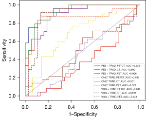 The P value represents the associations between different models. ONLY_TRAD denotes the model with only shallow features. RES_TRAD denotes the model with ResNet-deep and shallow features. VGG_TRAD denotes the model with VGG-deep and shallow features. CT, computed tomography; PET, positron emission tomography.