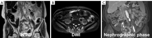 After completing six cycles of chemotherapy consisting of bevacizumab (400 mg) on day 1 + paclitaxel (300 mg) on day 1 + gemcitabine (1.6 g) on days 1 and 8, the patient underwent a follow-up CTU. The results revealed a significant reduction in the size of the ureteral lesion and metastatic lymph nodes compared to the previous scan (Figure 6), with the treatment efficacy evaluated as partial remission (PR). Subsequently, the patient received whole abdominopelvic intensity-modulated radiotherapy (62.5 Gy/25 fractions/5 weeks). One month later, urologic magnetic resonance urography (MRU) demonstrated a marked reduction in the size of the lesion (Figure 7). As of this writing, the patient is currently alive and well and continues to be under regular follow-up.