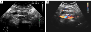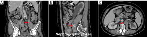 A urologic ultrasound examination revealed dilation in the upper left ureter, characterized by an internal diameter of approximately 1.60 cm. Additionally, a hypoechoic mass measuring 3.92 cm × 1.47 cm was observed 5.0 cm from the left renal hilum-ureteral junction (within the ureter), displaying a class I blood flow signal on color Doppler flow imaging (CDFI). Adjacent to the left renal hilum, an enlarged hypoechoic lymph node measuring about 2.33 cm in diameter was identified (Figure 1). Computed tomography urography (CTU) revealed a soft tissue density mass within the lumen of the left mid-ureter, appearing as a strip measuring approximately 1.20 cm at its widest point, with a measured area of involvement of about 4.10 cm. The CT attenuation values were 42 Hounsfield units (HU) in the plain phase, 73 HU in the corticomedullary phase, and 70 HU in the nephrographic phase, with enhancement scans displaying moderate enhancement. Both the ureter and the renal calyces above the lesion exhibited dilation and hydronephrosis, contributing to a reduction in both volume and perfusion of the left kidney. Adjacent to the abdominal aorta and left iliac vessels, multiple enlarged lymph nodes were evident (Figure 2).