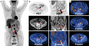 18F-FDG, 18F-fluoro-2-deoxy-d-glucose; PET/CT, positron emission tomography-computed tomography; SUVmax, maximum standardized uptake value; M, male; F, female; NA, not applicable; y, year; mo, month.