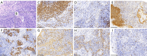 The patient underwent a CT-guided puncture biopsy of the left inguinal lymph node. Microscopically, the lymph node structure remained intact, displaying scattered lymphoid follicles, atrophied germinal centers, and fibrotic tissue hyperplasia in the interfollicular zone accompanied by plasma cell infiltration. Notably, no tumor cells were observed (Figure 4A,4B). Immunohistochemistry revealed positive expression of CD3, CD20, CD21 [highlighting the follicular dendritic cell (FDC) network], CD138, immunoglobin G (IgG), and key performance indicators (KPIs) (highlighting the histiocytes) (Figure 4C-4H). Additionally, 10% of the tumor cells demonstrated positivity for Ki-67 (Figure 4I). The possibility of DLBLC recurrence was excluded. The patient underwent further ureteroscopy with biopsy for pathology. Microscopic examination revealed infiltrative growth of poorly differentiated neoplastic cells forming nests, cords, and sheets within a desmoplastic stroma. (Figure 5A,5B). Immunohistochemistry showed positive expression of desmin, vimentin, synuclein (SYN), and cytokeratin (CK)8/18 (Figure 5C-5G). Fluorescence in situ hybridization (FISH) analysis with a break-apart probe confirmed the presence of EWSR1 and WT1 gene rearrangements in the neoplastic cells. The conclusive diagnosis was DSRCT of the ureter.