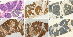 DSRCT belongs to the family of small round blue cell tumors and exhibits unique clinical, histologic, immunohistochemical, cytogenetic, and molecular features (1,3). Histologically, nests of small round tumor cells that coexpress epithelial, mesenchymal, and neural cell markers are surrounded by a cellular desmoplastic stroma, demonstrating commonalities with other round cell tumors. The gold standard for diagnosing DSRCT is the combination of histopathology and cytogenetics. It is crucial to acknowledge that DSRCT exhibits a polyphenotypic immune profile and considerable morphologic variation both among tumors and within the same neoplasm. The immunophenotype of DSRCT is marked by a polyphenotypic immune profile, encompassing epithelial markers [CK and epithelial membrane antigen (EMA)], neural markers [CD56 and neuron-specific enolase (NSE)], and muscle markers (vimentin and desmin), along with notable morphological diversity among tumors and within the same neoplasm (8). Smaller subsets express chromogranin, synaptophysin, CD56, neurofilament protein, and S100 protein. DSRCT is differentiated from other small round blue cell tumors by the presence of the t(11;22)(p13:q12) chromosomal translocation (9).