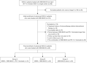 All patients with advanced NSCLC who underwent DEB-BACE between April 2017 and October 2022 at Beijing Hospital were enrolled and were subsequently divided into three groups according to whether MWA and/or immunotherapy was performed: group A, MWA + DEB-BACE + PD-1 blockade; group B, MWA + DEB-BACE; and group C: DEB-BACE alone. This retrospective study was conducted in accordance with the Declaration of Helsinki (as revised in 2013) and was approved by the institutional ethics review board of Beijing Hospital. Informed consent for this retrospective analysis was waived. The inclusion criteria were as follows: (I) age of 18–85 years, (II) diagnosis of NSCLC and a tumor stage of III B to IV B, (III) resistance or intolerance to standard treatments, and (IV) Eastern Cooperation Oncology Group (ECOG) performance status (PS) of 0–2. Meanwhile, the exclusion criteria were as follows: (I) treatment history of immunotherapy, (II) interval between DEB-BACE and ICIs longer than one month, (III) incomplete data, and (IV) follow-up <12 months.