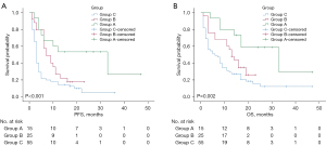 The details of the outcomes are presented in Table 2. The mean follow-up time was 35.1±15.2 months. A significantly higher DCR at 3 months after MWA or the first DEB-BACE session was observed in group A versus in groups B and C (100.0% vs. 76.0% vs. 45.5%; P<0.001). The estimated median PFS in the groups A–C groups was 33.0 [95% confidence interval (CI): 6.052–59.948], 7.0 (95% CI: 3.556–10.444), and 3.0 (95% CI: 2.491–3.509) months, respectively, whereas the estimated median OS in these groups was 33.0 (95% CI: 9.759–56.241), 13.0 (95% CI: 9.832–16.168), and 6.0 (95% CI: 1.963–10.037) months, respectively. The Kaplan-Meier method revealed that group A had prolonged median PFS (P<0.001; Figure 2A) and OS (P=0.002; Figure 2B) compared with the other two groups.