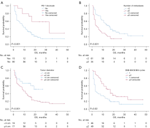 The results of univariate and multivariate analyses are shown in Tables 3 and 4. For patients with advanced NSCLC treated with DEB-BACE, the predictors of PFS included PD-1 blockade [hazard ratio (HR): 0.345, 95% CI: 0.162–0.733; P=0.006; Figure 3 and Figure 4A], tumor number (HR: 2.126, 95% CI: 1.184–3.815; P=0.01; Figure 4B), and DEB-BACE/BAI cycles (HR: 0.622, 95% CI: 0.388–0.997; P=0.04; Figure 4C), while the predictors of OS included PD-1 blockade (HR: 0.221, 95% CI: 0.096–0.508; P<0.001; Figure 5A), number of metastases (HR: 2.699, 95% CI: 1.589–4.585; P<0.001; Figure 5B), tumor diameter (HR: 4.324, 95% CI: 1.971–9.488; P<0.001; Figure 5C), and DEB-BACE/BAI cycles (HR, 0.550; 95% CI: 0.333–0.908; P=0.02; Figure 5D).