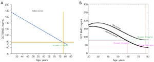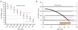 In this article, we list more literature data to support this observation. Figure 1A shows that, for Italian women at the age of 78 years, the mean QCT LS BMD has decreased to around 77 mg/mL (33), which is consistent with the data of Block et al. (31). This conclusion is supported by many other reports for Caucasian women, including Compston et al. (34), Sandor et al. (35), and Karantanas et al. (36), and Manisal et al. (37). Figure 1B compares data of US women by Block et al. (31) and Japanese women by Ito et al. (25). For Japanese women at the age of 78 years, the mean QCT LS BMD has decreased to around 40 mg/mL, which is consistent with the data of Fujii et al. (24). For a BMD value of 80 mg/mL, according to the same study, for Japanese women, the corresponding age would be less than 60 years. Figure 2A shows that, for Korean women at the age of 78 years, the mean QCT LS BMD decreases to around 50 mg/mL, while for a mean BMD value of 80 mg/mL, the corresponding age is around 67 years (38). Figure 2B shows that, for Thai women at the age of 78 years, the mean QCT LS BMD decreases to less than 45 mg/mL, while for a BMD value of 80 mg/mL, the corresponding age is around 67 years (39). These QCT LS BMD results for older East Asian women are consistent with many other studies conducted on Chinese women (40-43). For example, Zhang et al. (40) reported a study of healthy subjects in which the mean QCT LS BMD was 82.39±27.45 mg/mL for females aged 60–69 years and 63.78±30.59 mg/mL for females aged ≥70 years. In a group of healthcheck women, Xuan et al. (41) reported that the mean QCT LS MBD was 63.9±29.7 mg/mL for older participants (>60 years). Similarly, in a group of BMD examinees (excluding those with disorders or medication histories that can affect bone metabolism), Wang et al. (42) reported that the mean QCT LS MBD was 62.4±28.3 mg/mL for older female participants (>60 years). Hsu et al. (43) studied abdominal CT scan examinees (excluding those with disorders or medication histories that can affect bone metabolism). At the age of 63 years, the mean QCT LS MBD was around 80 mg/mL for their female participants. Moreover, Melton et al. (44) reported that, at the age of 62 years, the mean QCT LS BMD of Vietnamese women in the US was 26 mg/mL less than that of US Caucasian women.