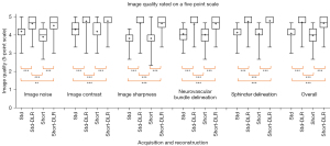 The perceived image quality (Figure 1) was rated better in all categories in the short-DLR sequence compared to the standard sequence (without DLR, P<0.001 to P=0.004). No significant difference was observed between standard-DLR and short-DLR or standard and short sequences (Figure 2, Table S1). Images reconstructed with DLR had significantly better sharpness compared to non-DLR reconstructions (P<0.001, Table S1, Figure 3). Even short acquisition with DLR had a better image sharpness than standard acquisition without DLR (P<0.001). No difference in SNR was observed between DLR and standard reconstruction both in the short acquisitions (P=0.53) or in the standard acquisitions (P=0.91). Both short and short-DLR had lower SNR compared to the standard and standard-DLR (P<0.001).