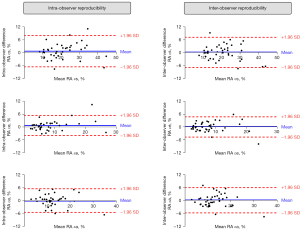 The intra- and inter-observer reproducibility for RA deformation measurements was evaluated in 40 randomly selected DCM patients. Intra-observer reproducibility was assessed by the first author who re-analyzed the same 40 patients after 1 month. Inter-observer reproducibility was analyzed by 2 independent observers, blinded to measurements (Y. Gao and J. Shi with more than 5 years of experience).