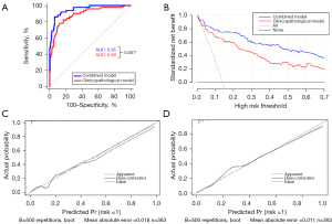 The combined model showed a better discrimination ability for predicting a high RS with a higher AUC of 0.95 (95% CI: 0.93–0.97) compared with the clinicopathological model (AUC =0.89; 95% CI: 0.86–0.92) (Figure 2A). Consistently, the DCA curves revealed more clinical benefit for predicting a high RS of the combined model (Figure 2B). Both of the models were calibrated well (Figure 2C,2D).