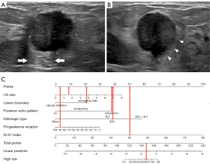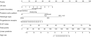 Therefore, the aim of this study was to investigate the US features associated with the ODX RS and to construct a nomogram combining US imaging biomarkers with clinicopathological factors to predict a high RS. The proposed nomogram can potentially be used in clinical practice to predict patients at high risk. We present this article in accordance with the TRIPOD reporting checklist (available at https://qims.amegroups.com/article/view/10.21037/qims-23-1620/rc).