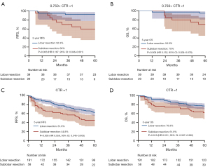The 5-year OS revealed significant differences between lobar-resection and sublobar-resection groups of tumor size no more than 2 cm (Figure 6A, 5-year RFS: 83.3% vs. 74.6%, P=0.11, HR =0.589, 95% CI: 0.293–1.182; Figure 6B, 5-year OS: 91.1% vs. 80.6%, P=0.03, HR =0.421, 95% CI: 0.175–1.015). When we evaluated the outcomes based on CTR classification, both the 5-year RFS and OS were significantly different between the lobar-resection and sublobar-resection groups in NSCLC ≤2 cm with CTR >0.750 (Figure 6C, 5-year RFS: 77% vs. 60%, P=0.02, HR =0.474, 95% CI: 0.228–0.983; Figure 6D, 5-year OS: 87.8% vs. 69.6%, P=0.008, HR =0.348, 95% CI: 0.139–0.869). However, for NSCLC ≤2 cm with CTR ≤0.750, no difference in both RFS and OS was found between the lobar-resection and sublobar-resection groups (5-year RFS: 100% vs. 100%, 5-year OS: 100% vs. 100%).