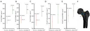 Another feature in Figure 4 is that there was a good separation between the QCT BMD measures of the control subjects and those of the patients, both for FN FFx and for IT FFx. If we assume their QCT BMD data follow normal distribution, simulated values considering the mean and SD of the data can be generated. We conducted simulation 6–7 times for each value, and we also assumed that FN FFx and IT FFx each counted for 50% of hip FFx (22,25), and the results are shown in Figure 5A-5C. Figure 5 shows the differentiation between hip FFx patients and control subjects is better when males’ and females’ hip BMD measures are separated than when males’ and females’ hip BMD measures are mixed. This is consistent with the data of Cheng et al. (26) shown in Figure 5D,5E. While results of Xu et al. (20) confirm an advantage in applying gender-specific BMD thresholds for identifying female and male at-risk patients, how generalizable of their good performance of QCT BMD measure in separating at-risk patients and controls remains unknown.